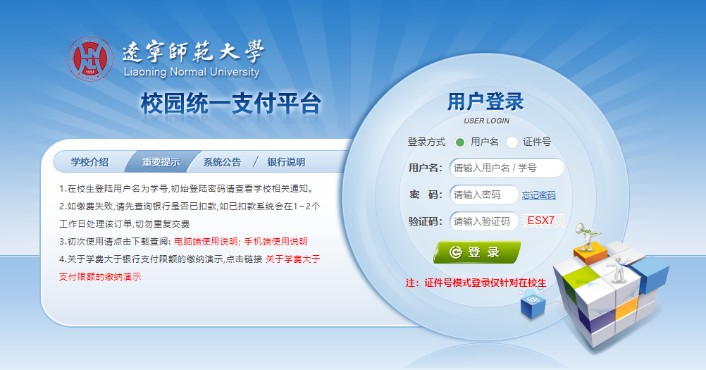 (2)手机端登录可微信、支付宝扫描“辽宁师范大学校园统一支付平台”二维码登录缴费。